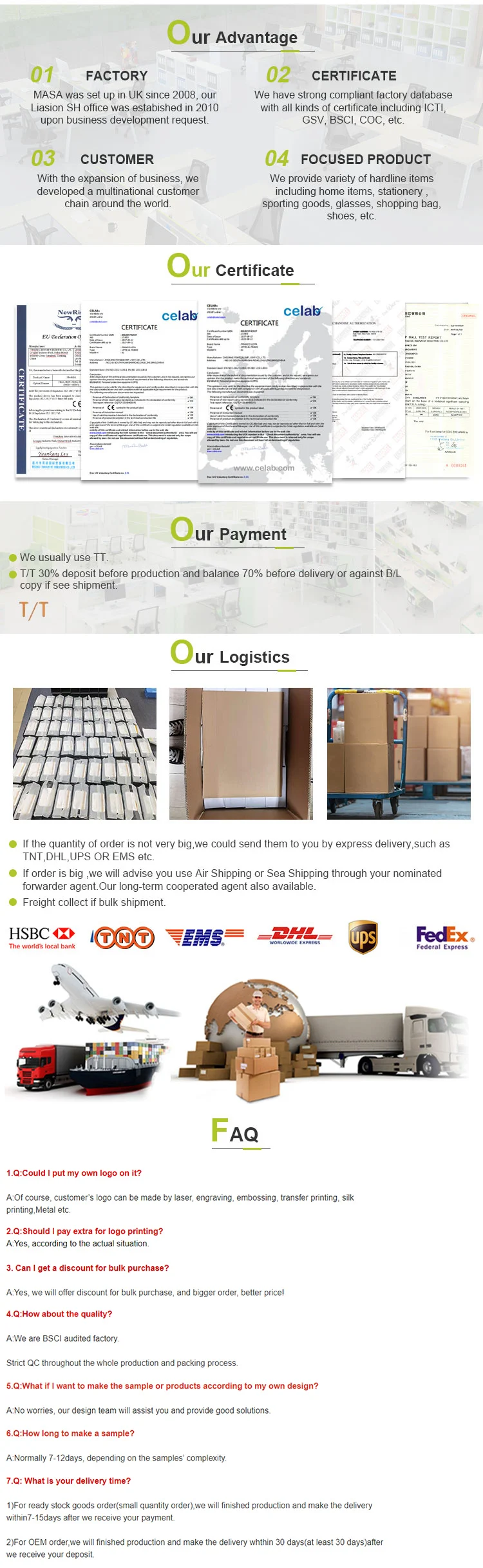 MASA was set up in UK since 2013, our Liasion SH branch was established in 2010 upon business development request.Since 2022, we set up our branch in Yiwu China area in order to support overseas online and traditional ODM customers.Sunglasses, toys and accessories are our main product categories, while we also provide variety of hardline items including home items, stationery, sporting goods, pets, toys, slippers, shopping bag, shoes, bags etc.We are keen in licensed items and have strong compliant factory database with all kinds of crtfc including ICTI, GSV, BSCI, COC, etc.With the expansion of business, we developed a multinational customer chain around the world.
