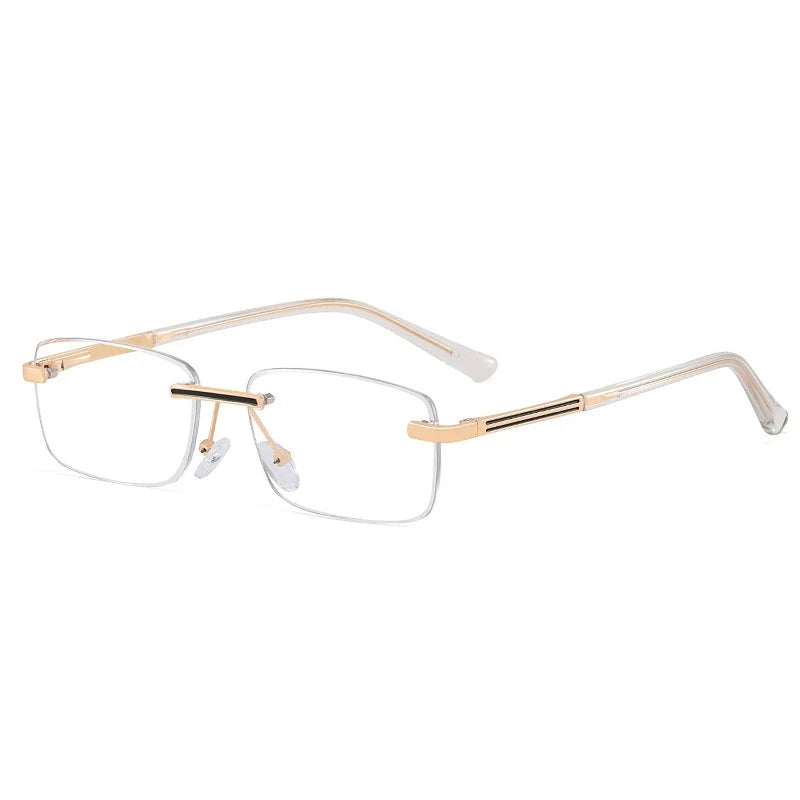 The glasses feature a rimless frame with a solid pattern and rectangle shape, offering a chic and versatile style.
