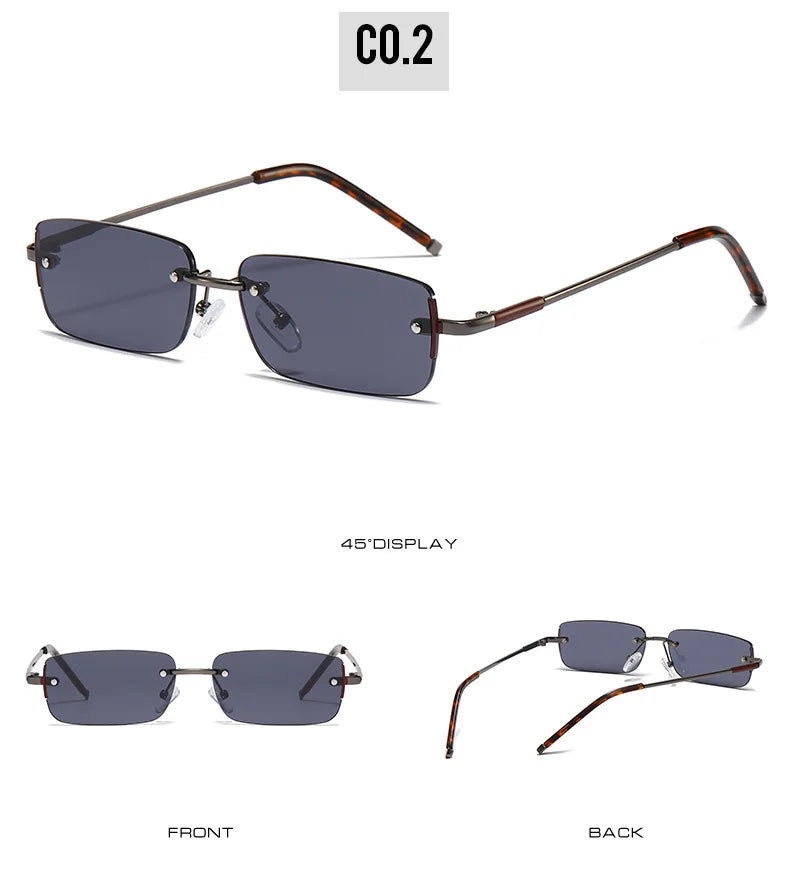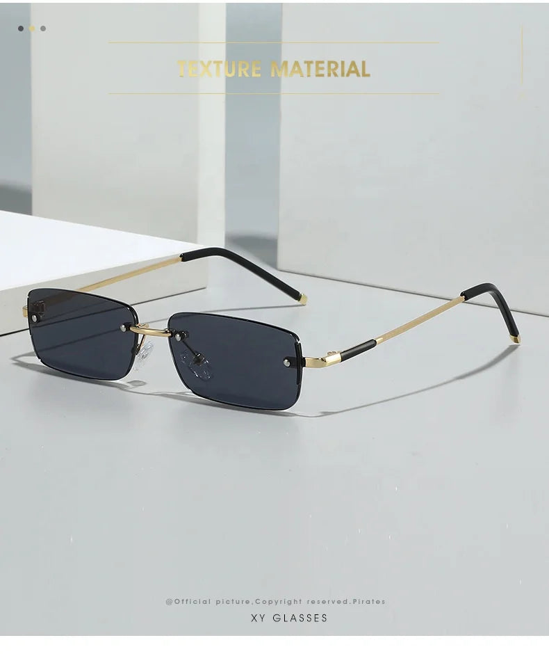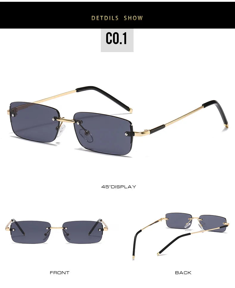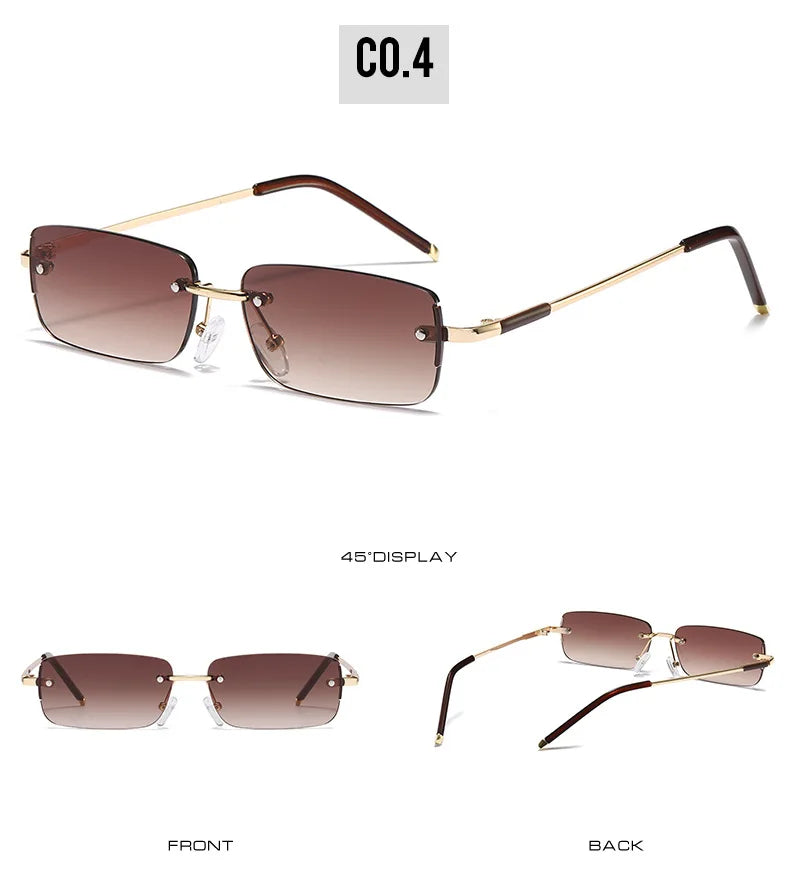 These sunglasses have a rimless rectangle design, offering a sleek and modern look that complements any face shape.